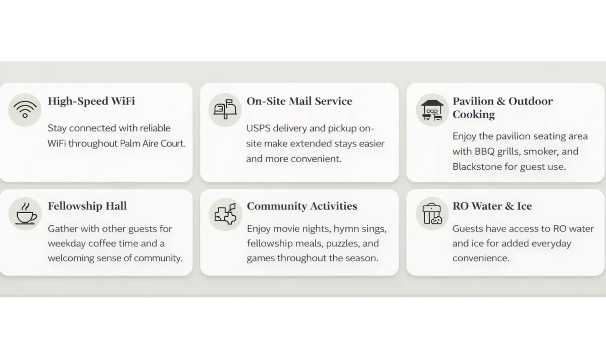 Palm Aire Court offers the everyday comforts you need along with a strong sense of community. Whether you’re staying for a week or the season, you’ll find it easy to settle in.